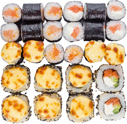 Бекон, сливочный сыр, огурец, лук фри, икра тобико, сырный соус (майонез, сыр, икра тобико)