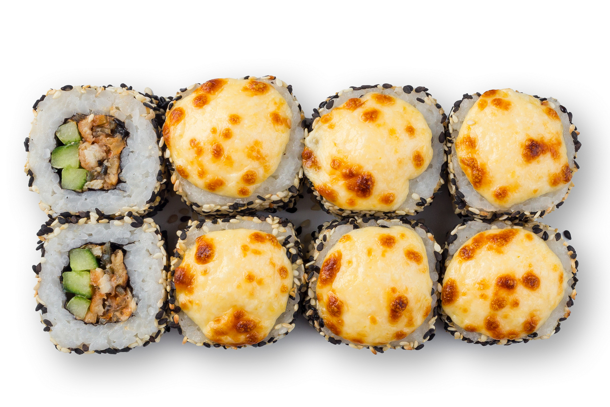 Угорь, огурец, соус спайси, майонез, сыр гауда, кунжут.
