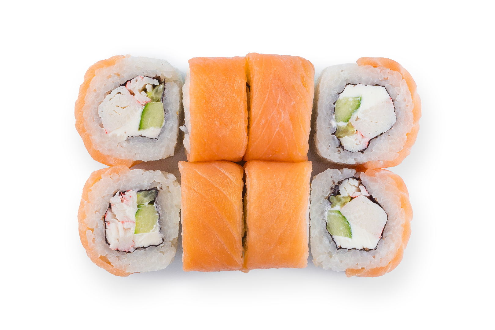 Тигровые креветки, лосось, сливочный сыр, огурец, майонез, сыр гауда, икра тобико.