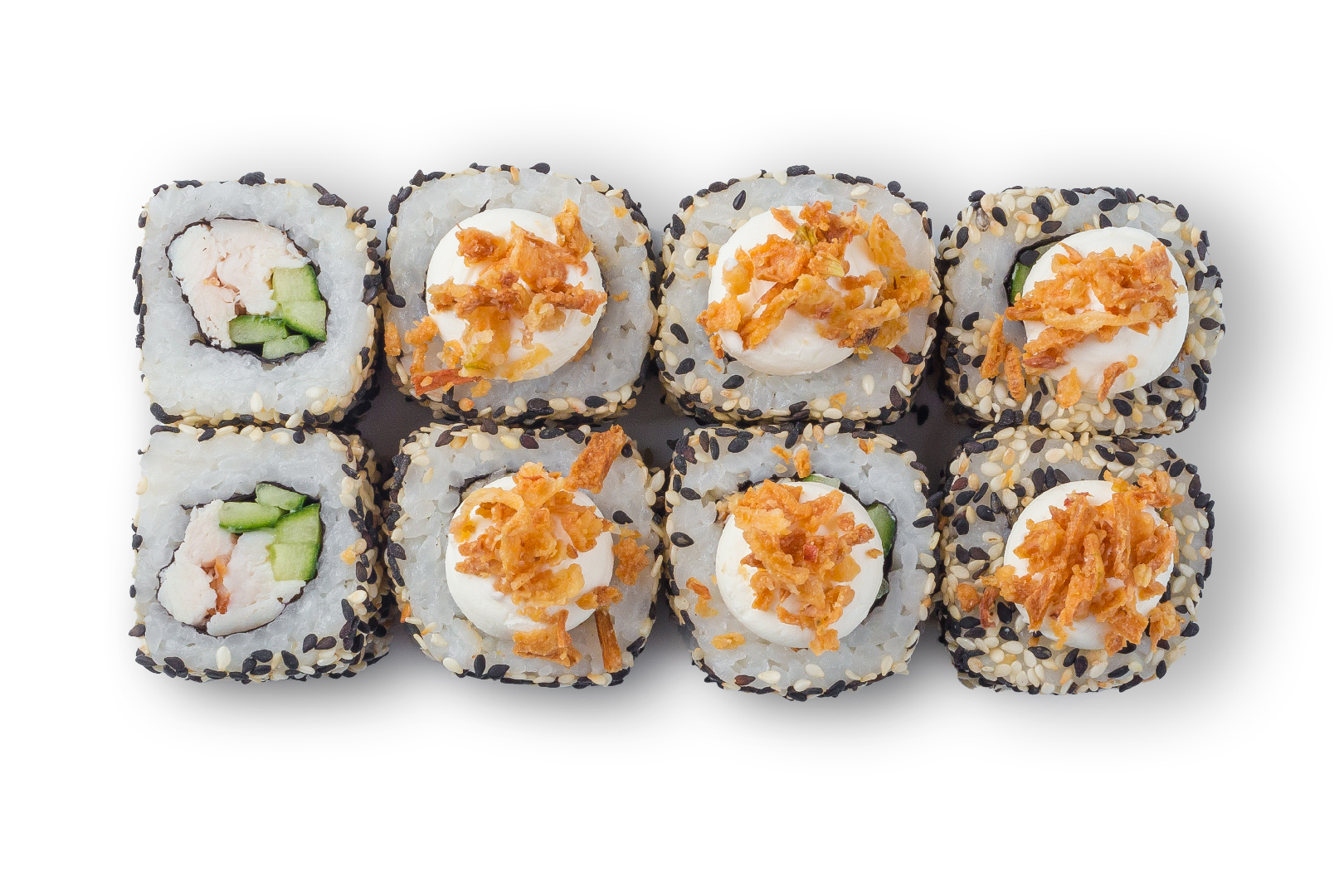 Копченая курица, огурец, сливочный сыр, кунжут, лук фри