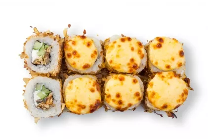 Угорь, сливочный сыр, огурец, майонез, сыр гауда, стружка тунца.