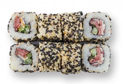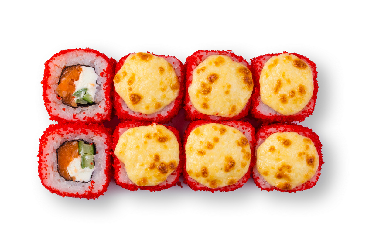 Лосось, сливочный сыр, огурец, майонез, сыр гауда, икра тобико.