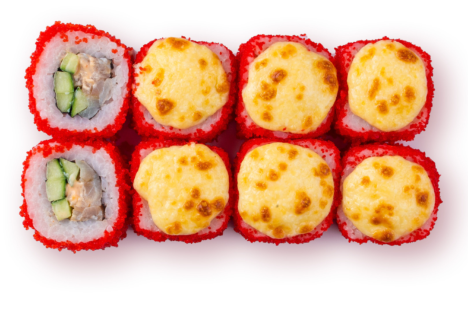 Окунь, огурец, соус спайси, майонез, сыр гауда, красная тобико