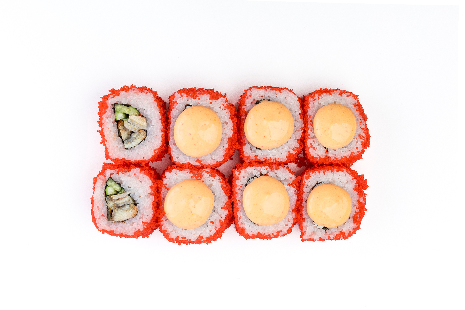 Копчёная курица, огурец, майонез, лук фри, стружка тунца