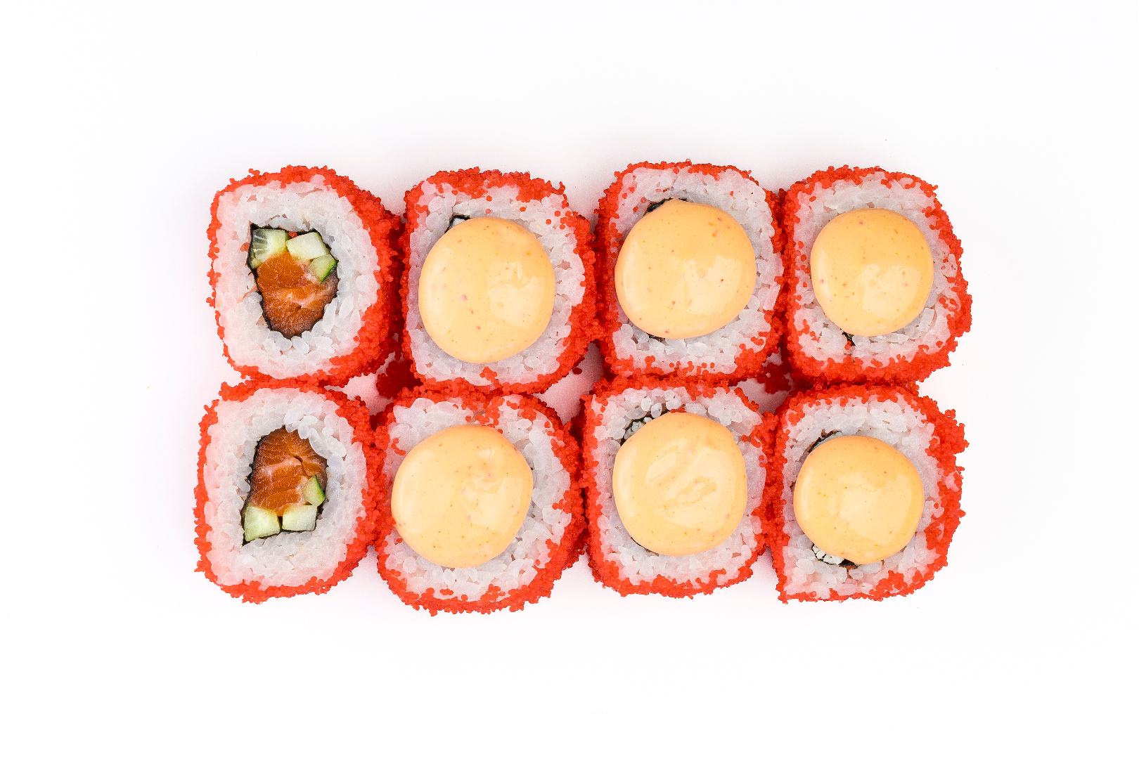 Лосось, соус спайси, огурец, лук фри, майонез, сыр гауда.
