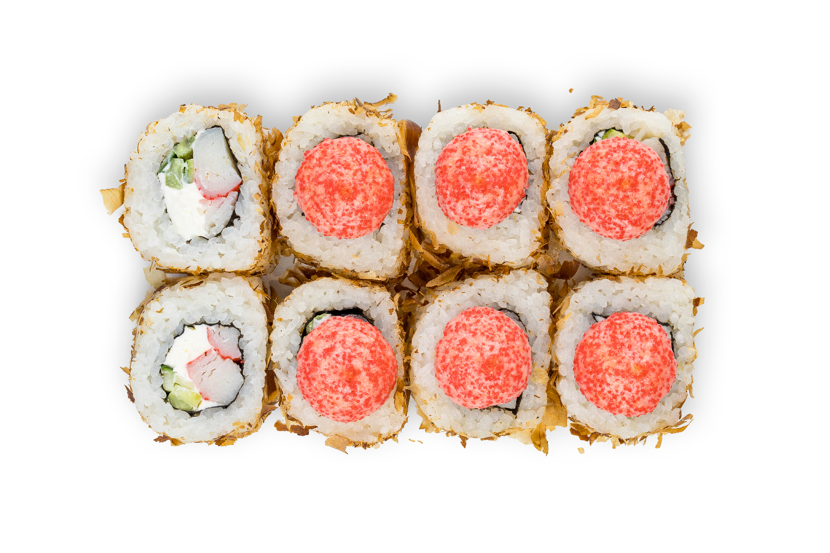 Копченый лосось, огурец, сливочный сыр, майонез, сыр гауда, икра тобико.