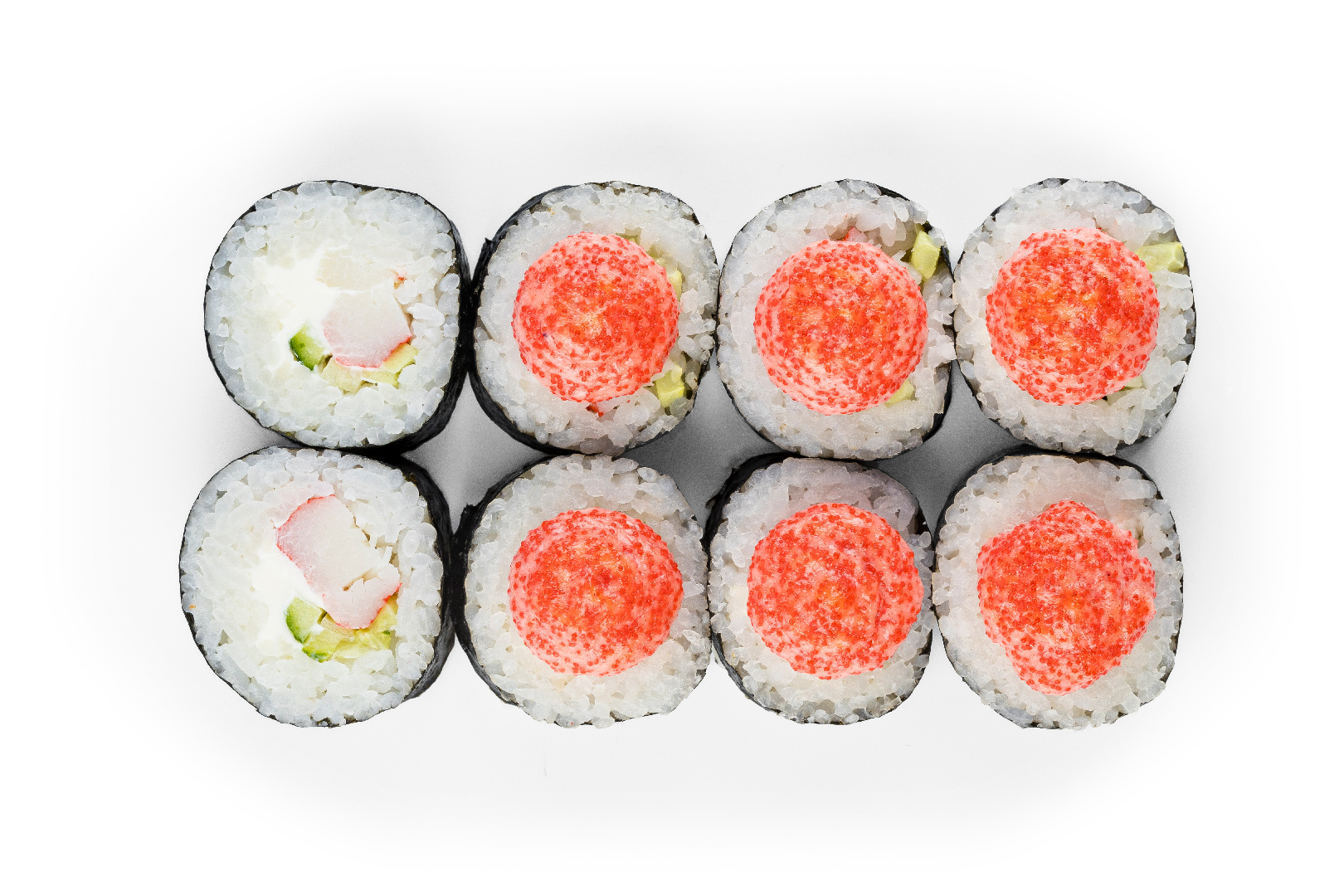 Имитация краба, огурец, сливочный сыр, сырный соус (майонез, сыр, икра тобико)