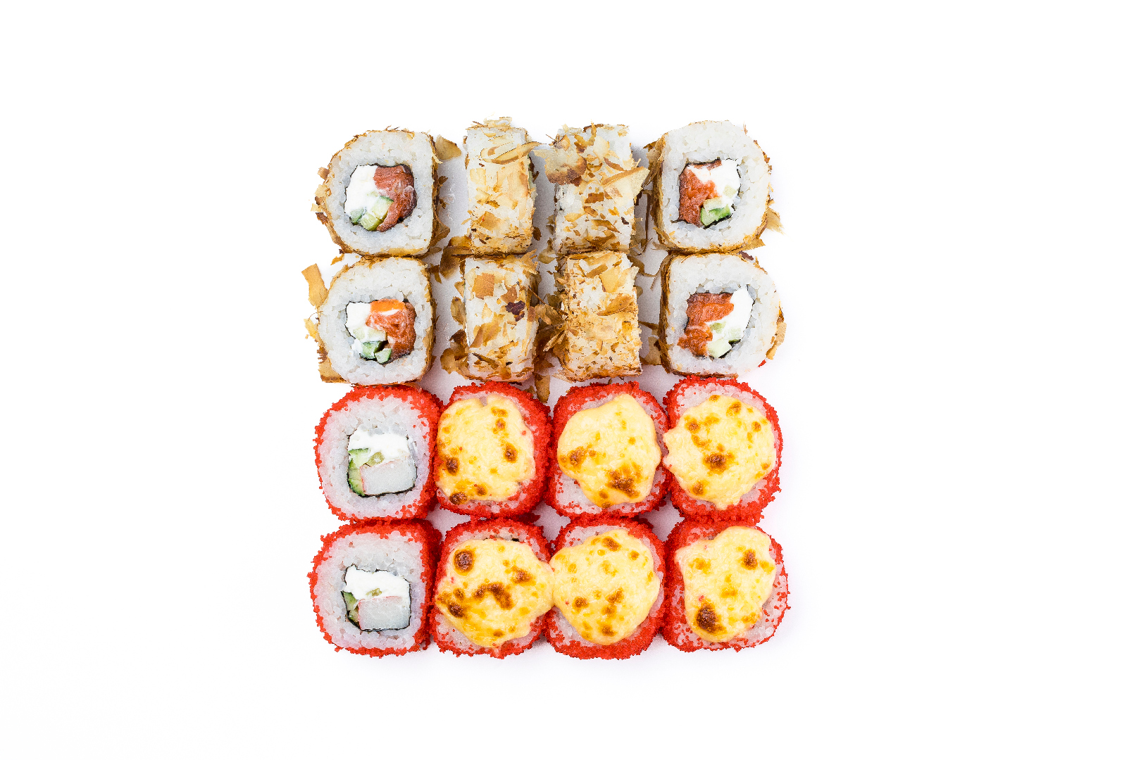 Имитация краба, огурец, сливочный сыр, майонез, сыр гауда, икра тобико.