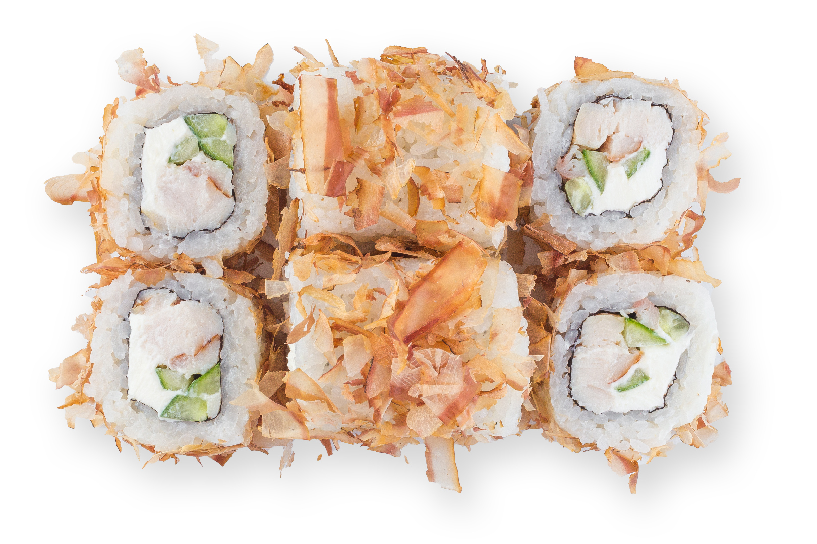 Копченая курица, огурец, сливочный сыр, стружка тунца