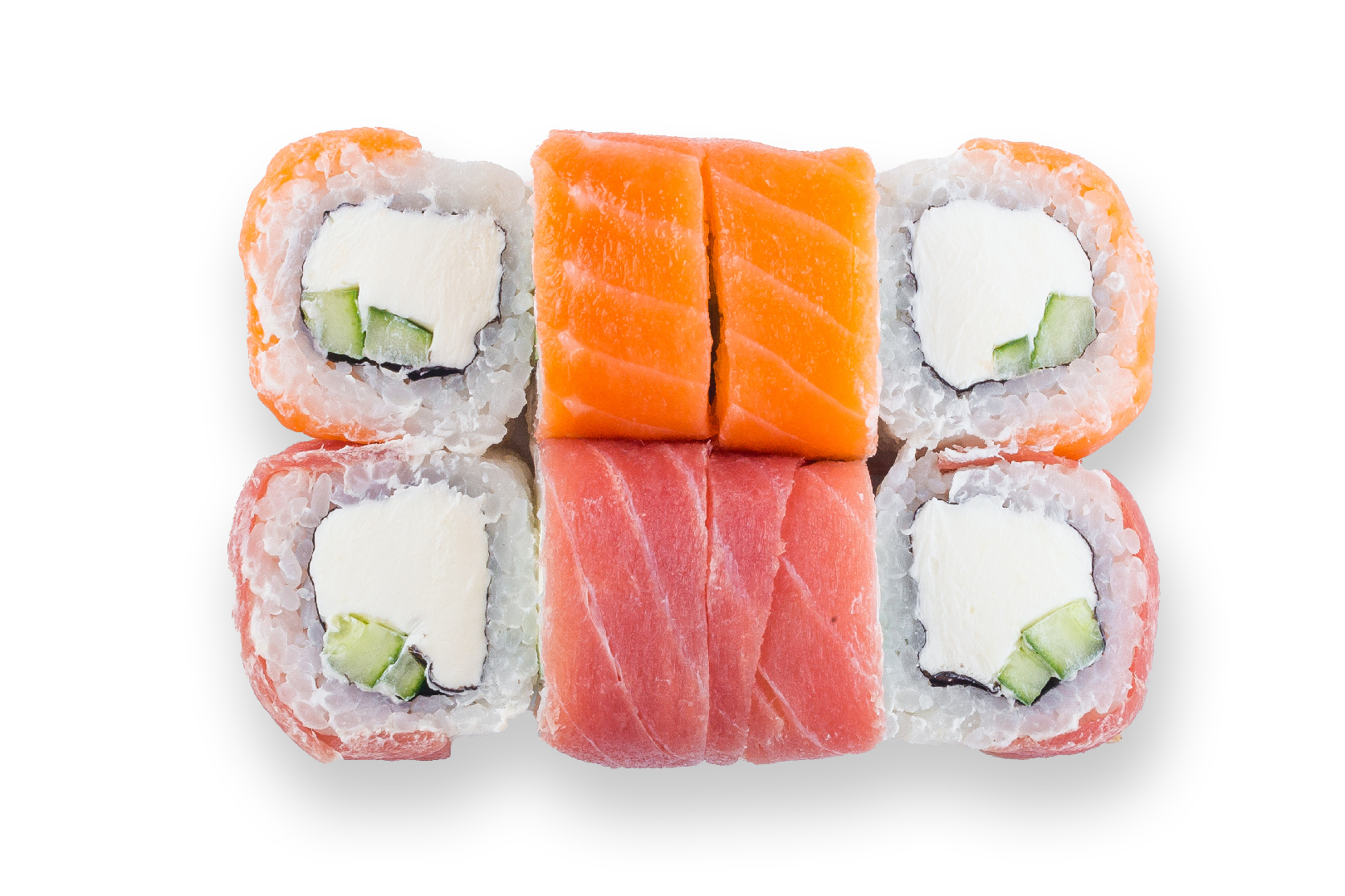Угорь, сливочный сыр, огурец, лосось, соус унаги, кунжут