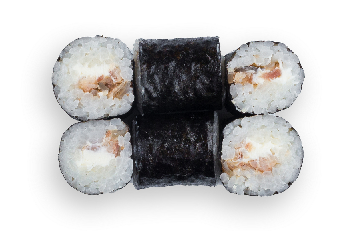 Тигровые креветки, огурец, сливочный сыр, майонез, сыр гауда, икра тобико.