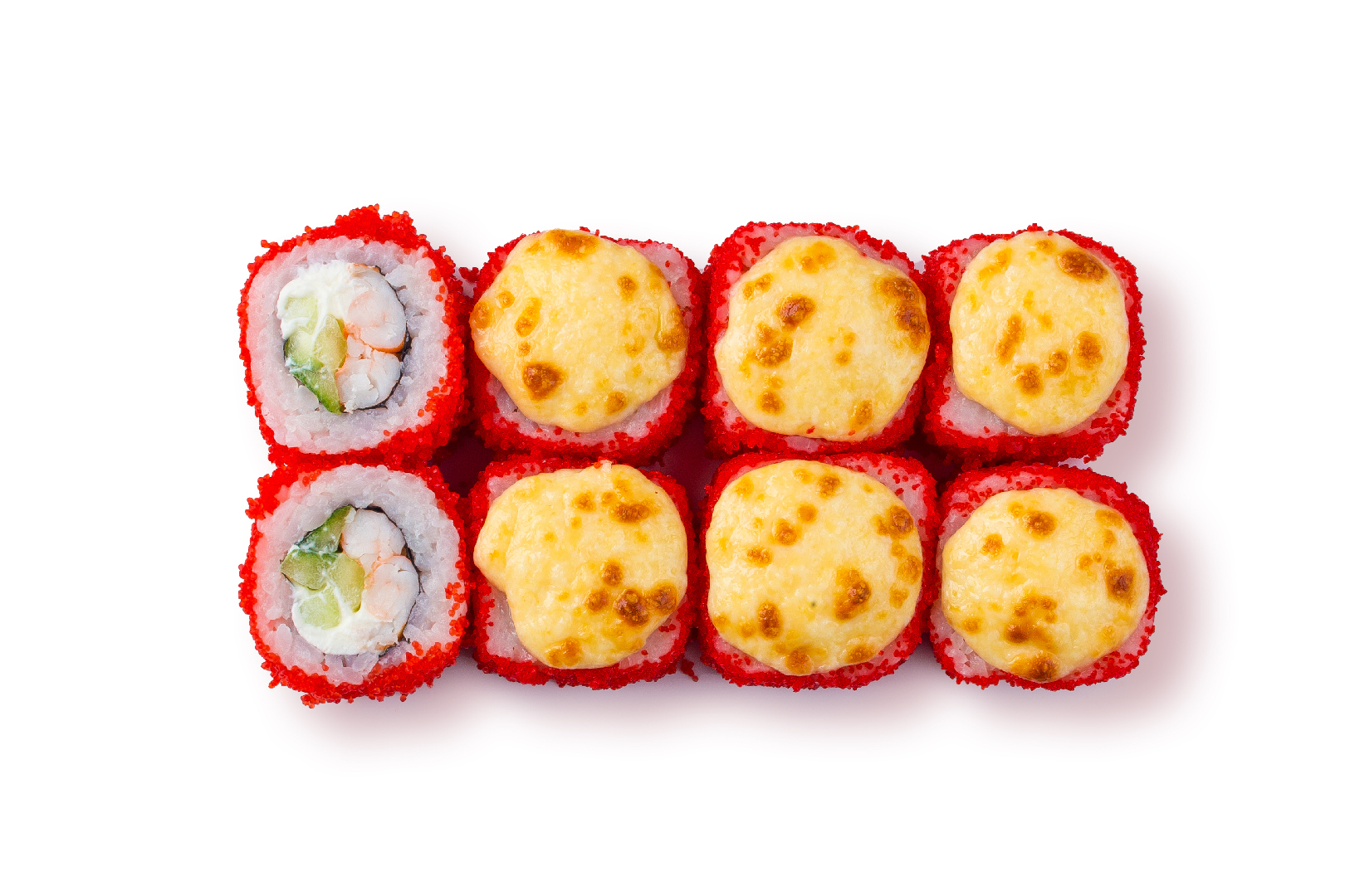 Тигровые креветки, огурец, сливочный сыр, майонез, сыр гауда, икра тобико.