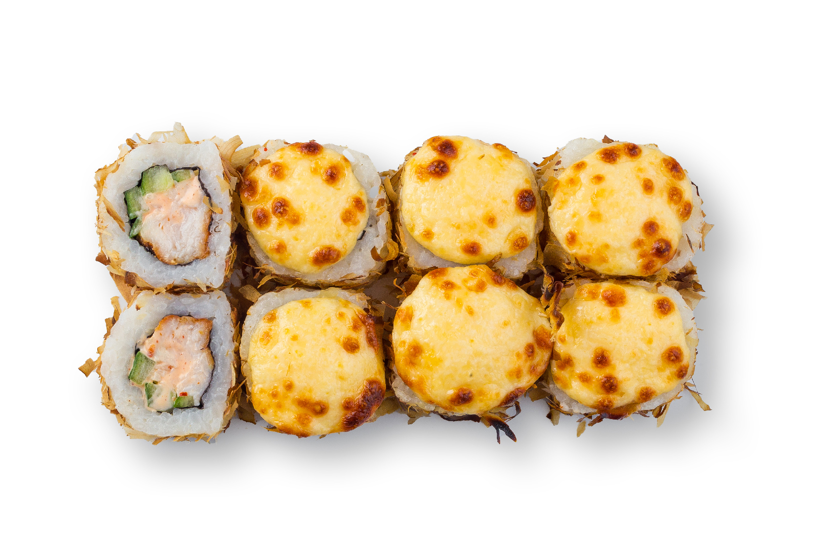 Угорь, сливочный сыр, огурец, майонез, сыр гауда, стружка тунца.
