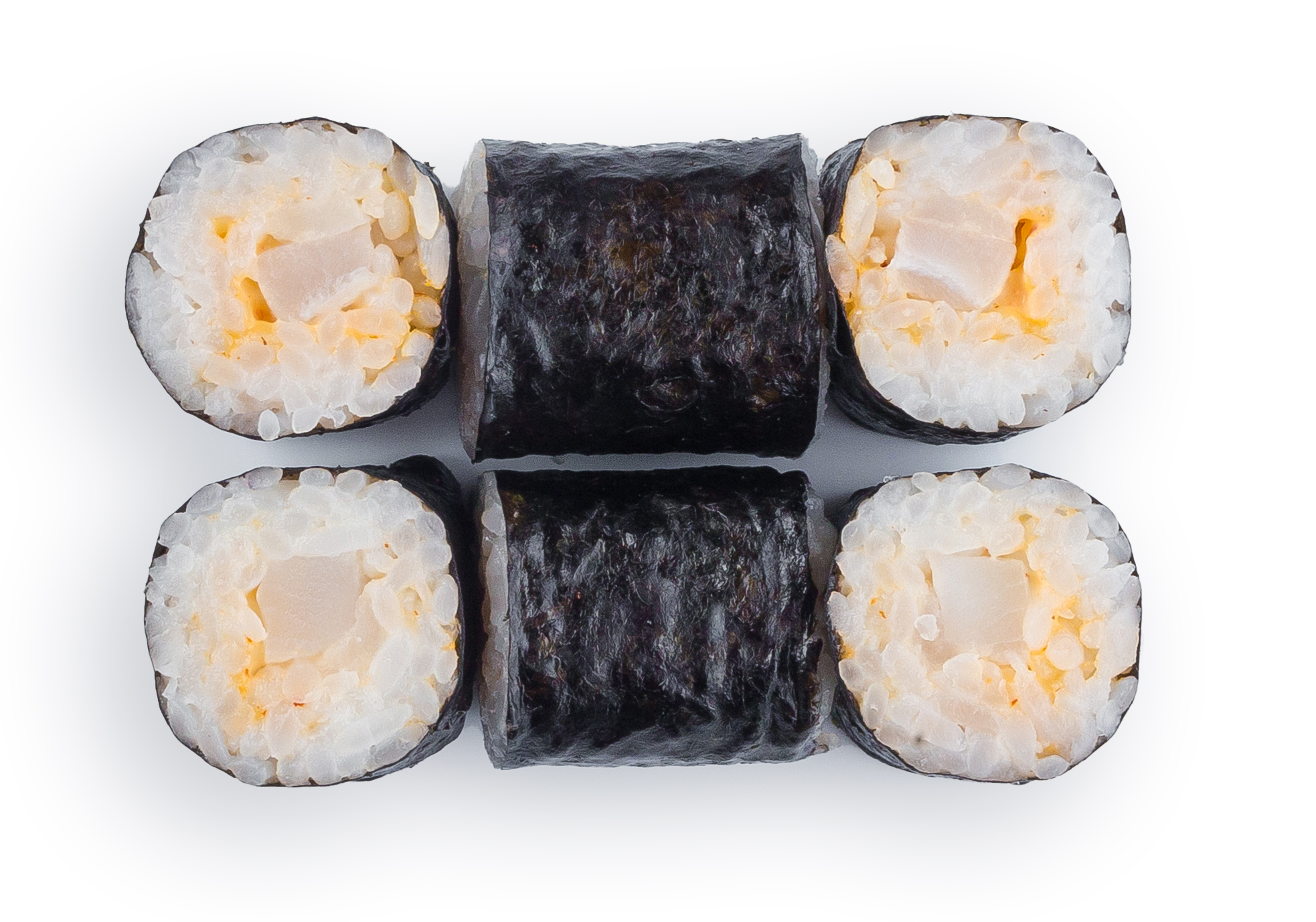 Копченая курица, огурец, сливочный сыр, майонез, сыр гауда, икра тобико.