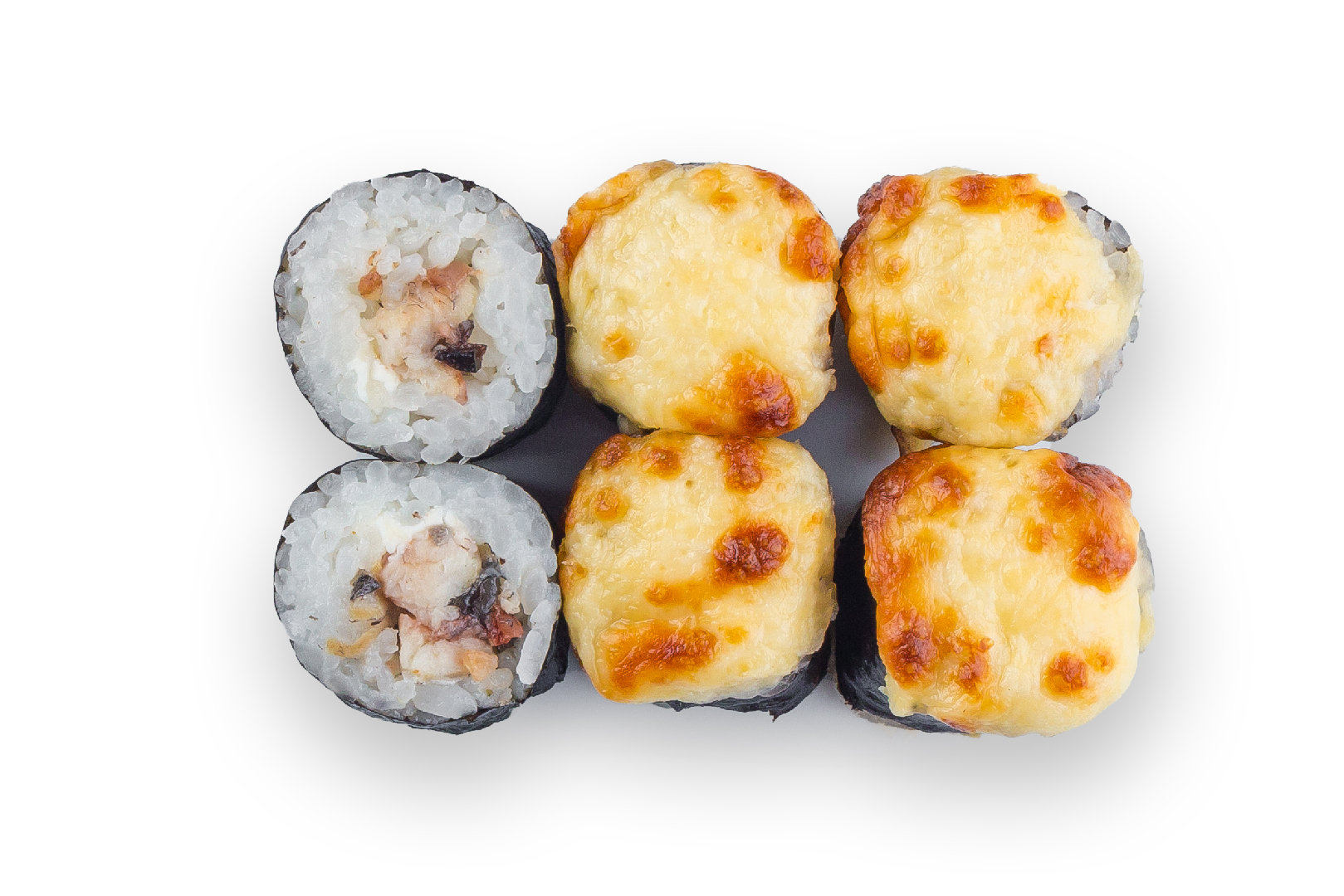 Копчёный лосось, имитация краба, огурец, сливочный сыр.
