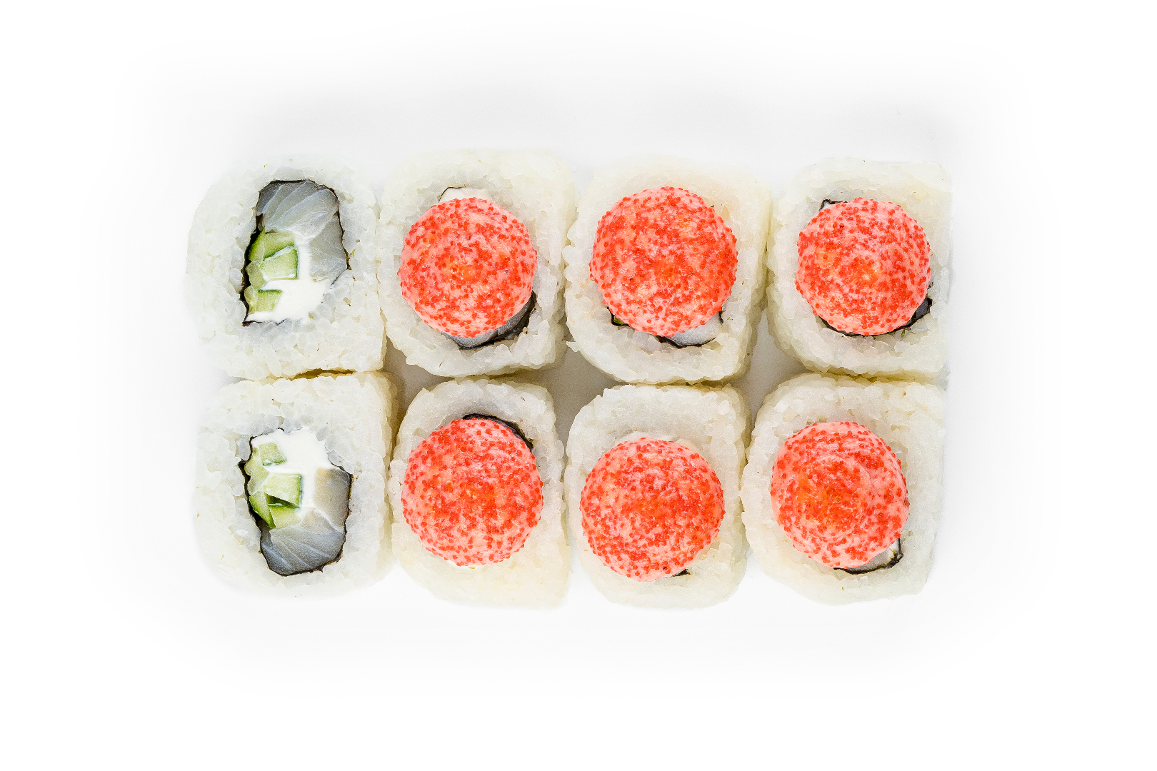Окунь, огурец, сливочный сыр, сырный соус (майонез, сыр, икра тобико)