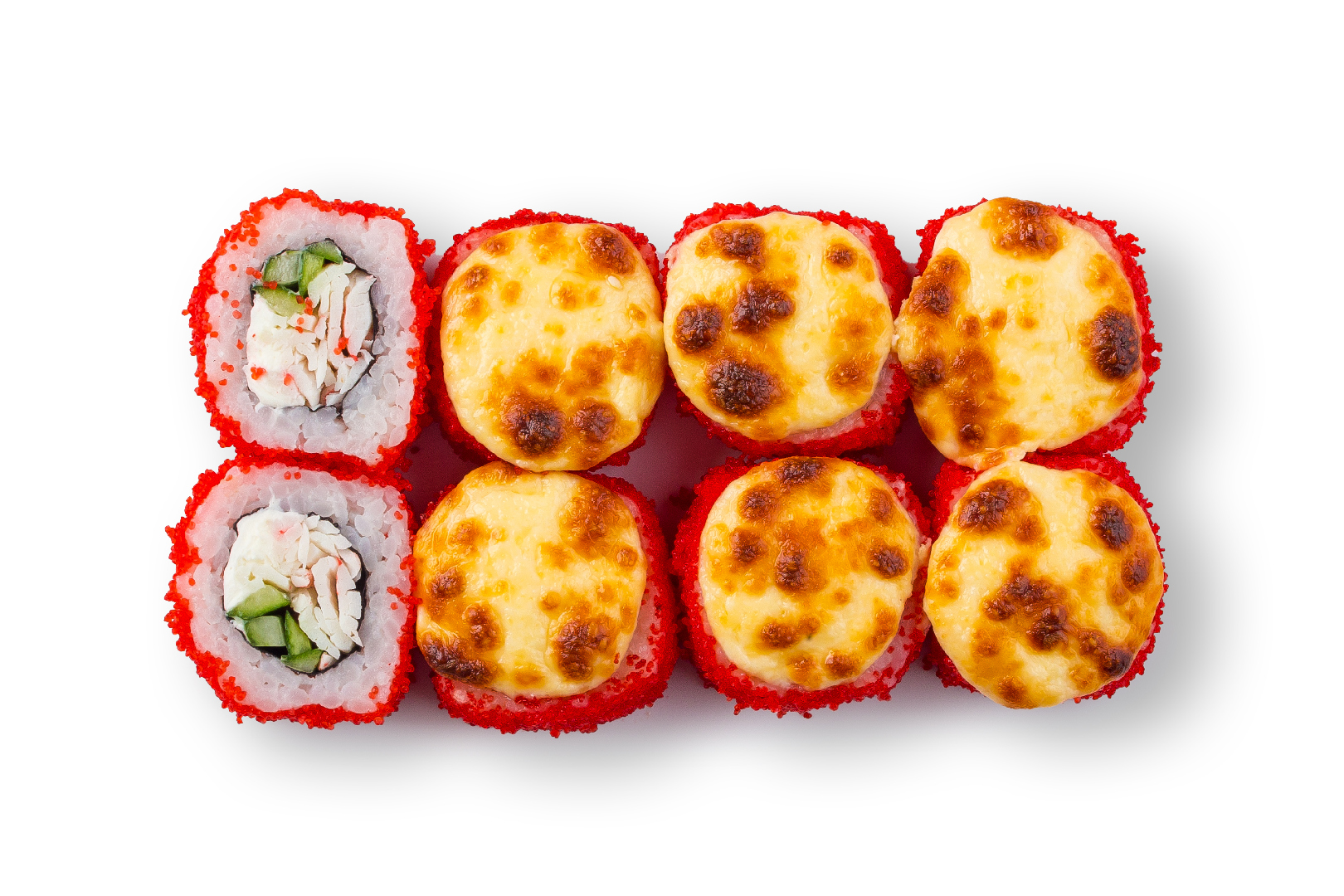 Имитация краба, огурец, сливочный сыр, майонез, сыр гауда, икра тобико.