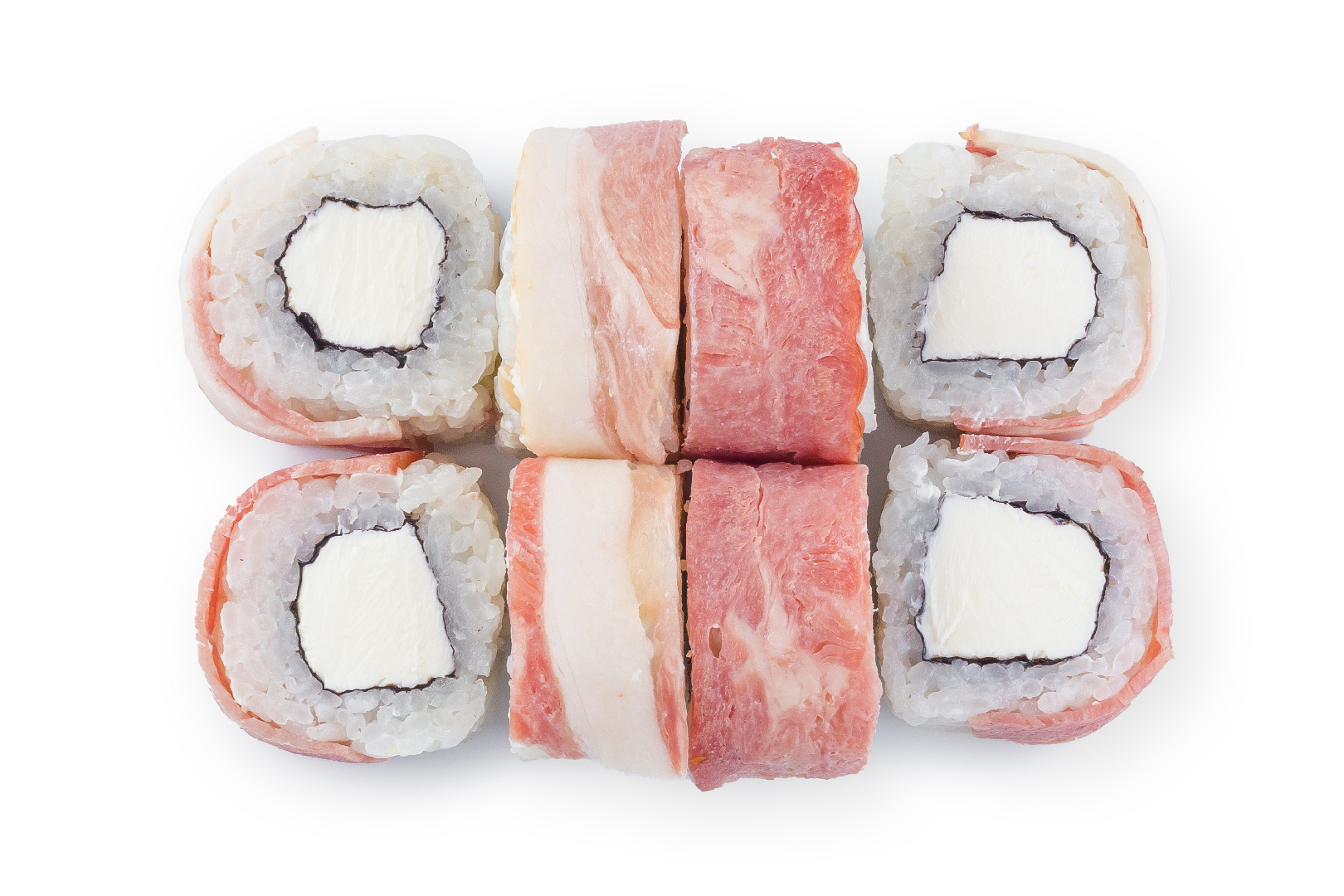 Копченая курица, огурец, сливочный сыр, кунжут, лук фри