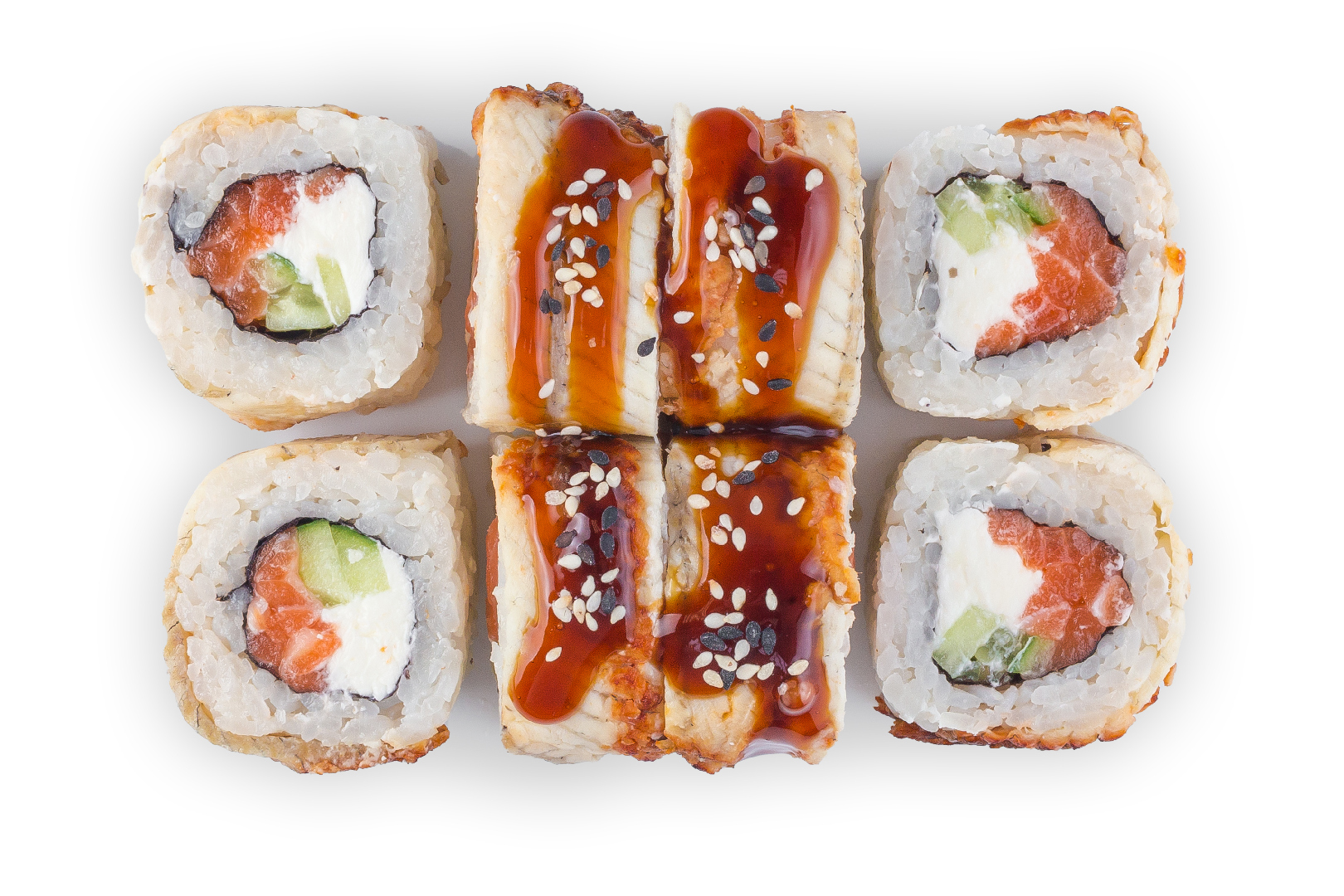 Угорь, сливочный сыр, огурец, лосось, соус унаги, кунжут