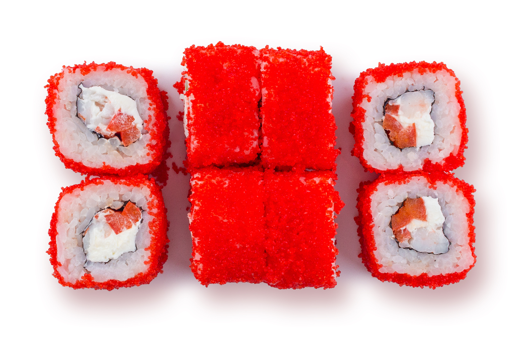 Тигровые креветки, болгарский перец, сливочный сыр, икра тобико