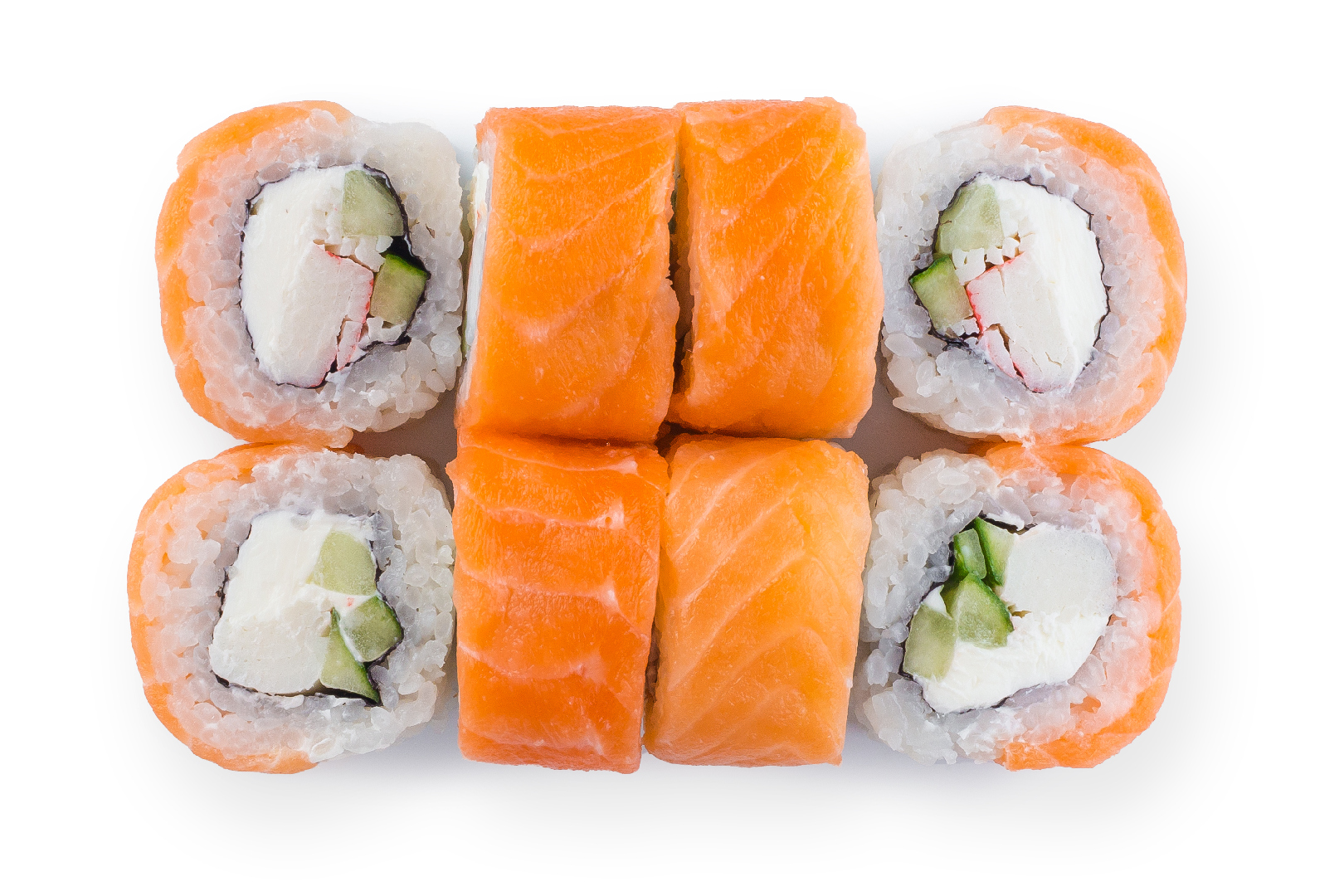 Копчёный лосось, имитация краба, огурец, сливочный сыр.
