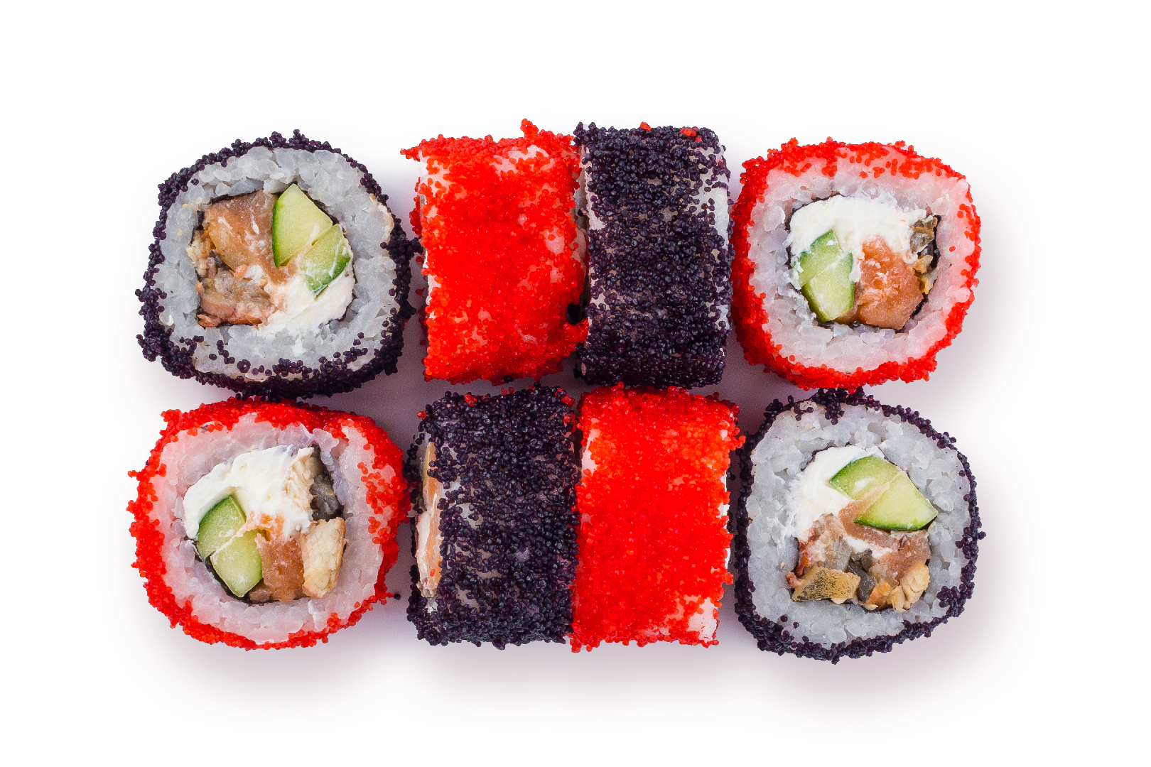 Копченая курица, огурец, сливочный сыр, кунжут, лук фри