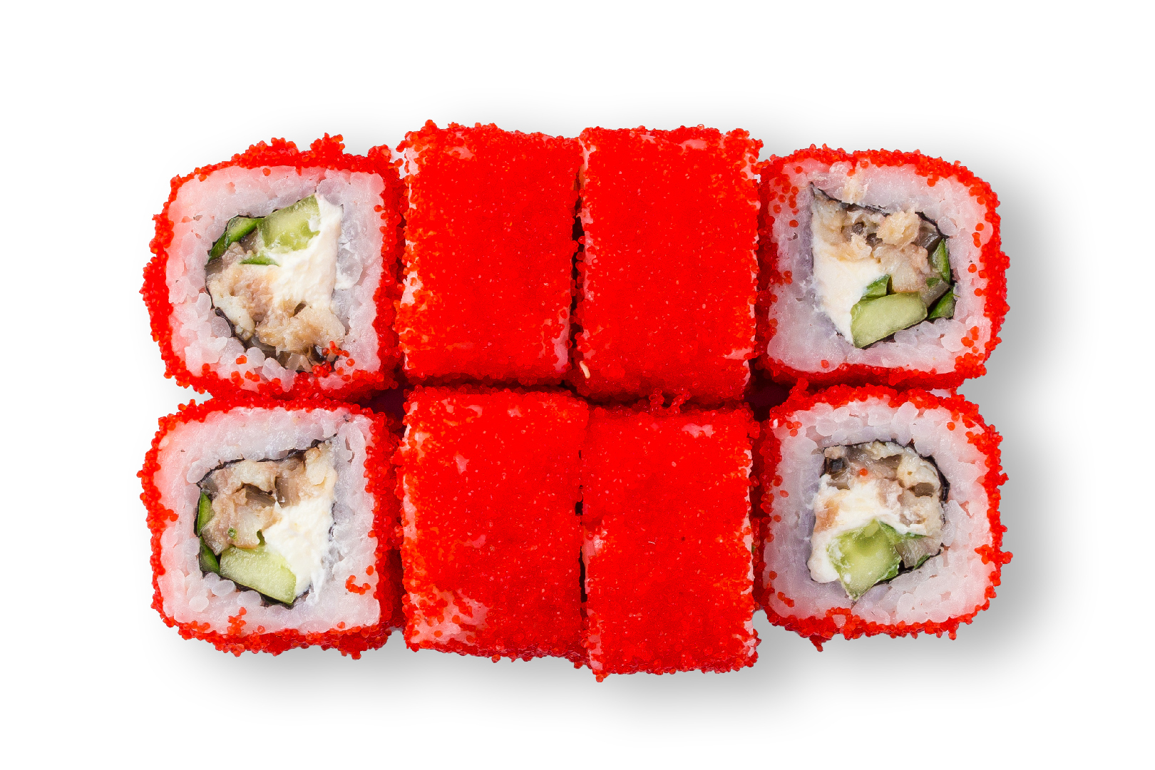 Угревидный кларий, огурец, сливочный сыр, икра тобико