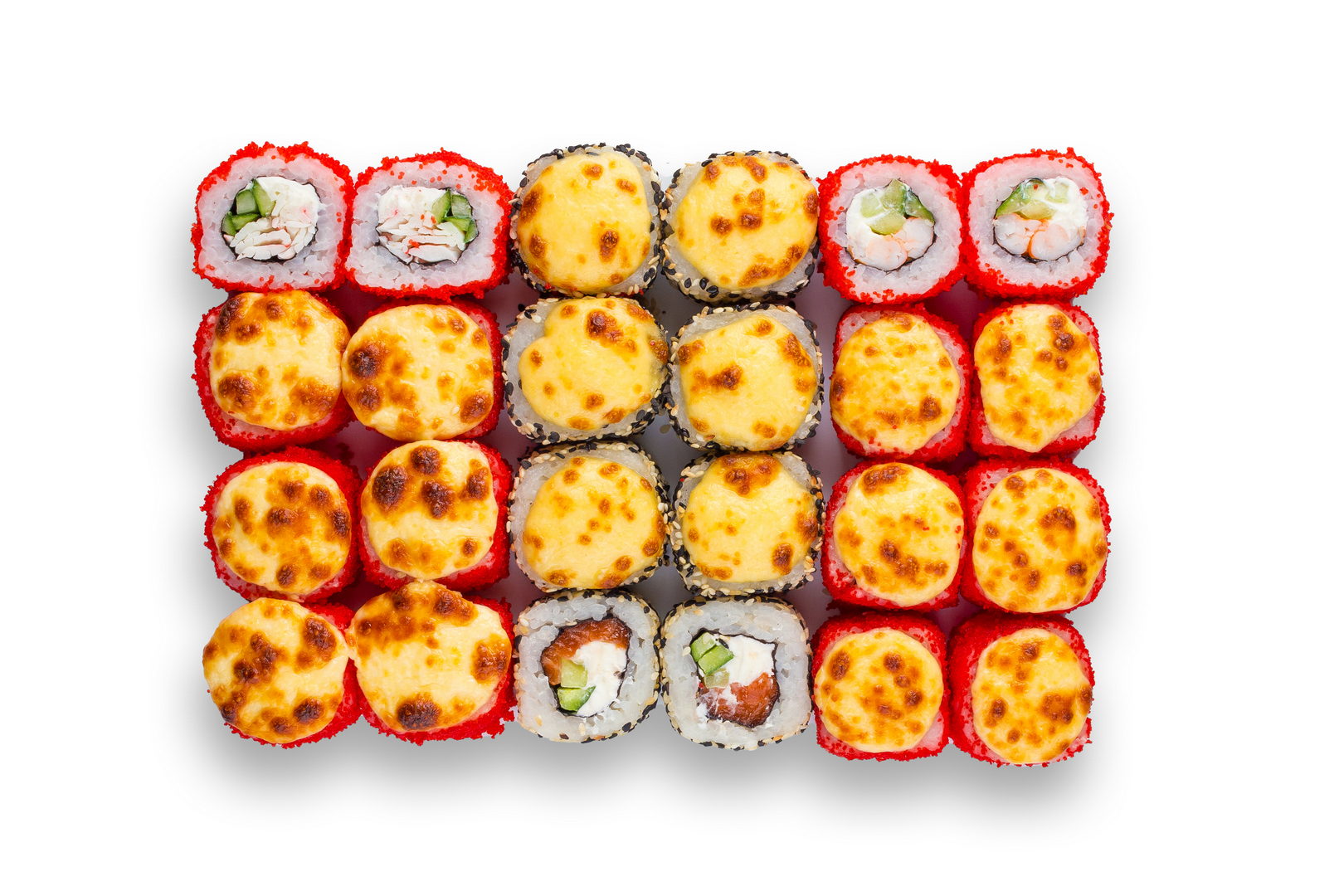 Копченый лосось, огурец, сливочный сыр, майонез, сыр гауда, икра тобико.