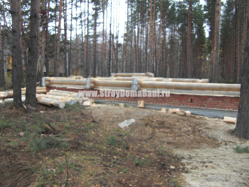 Закладка первого венца срубов из бревна